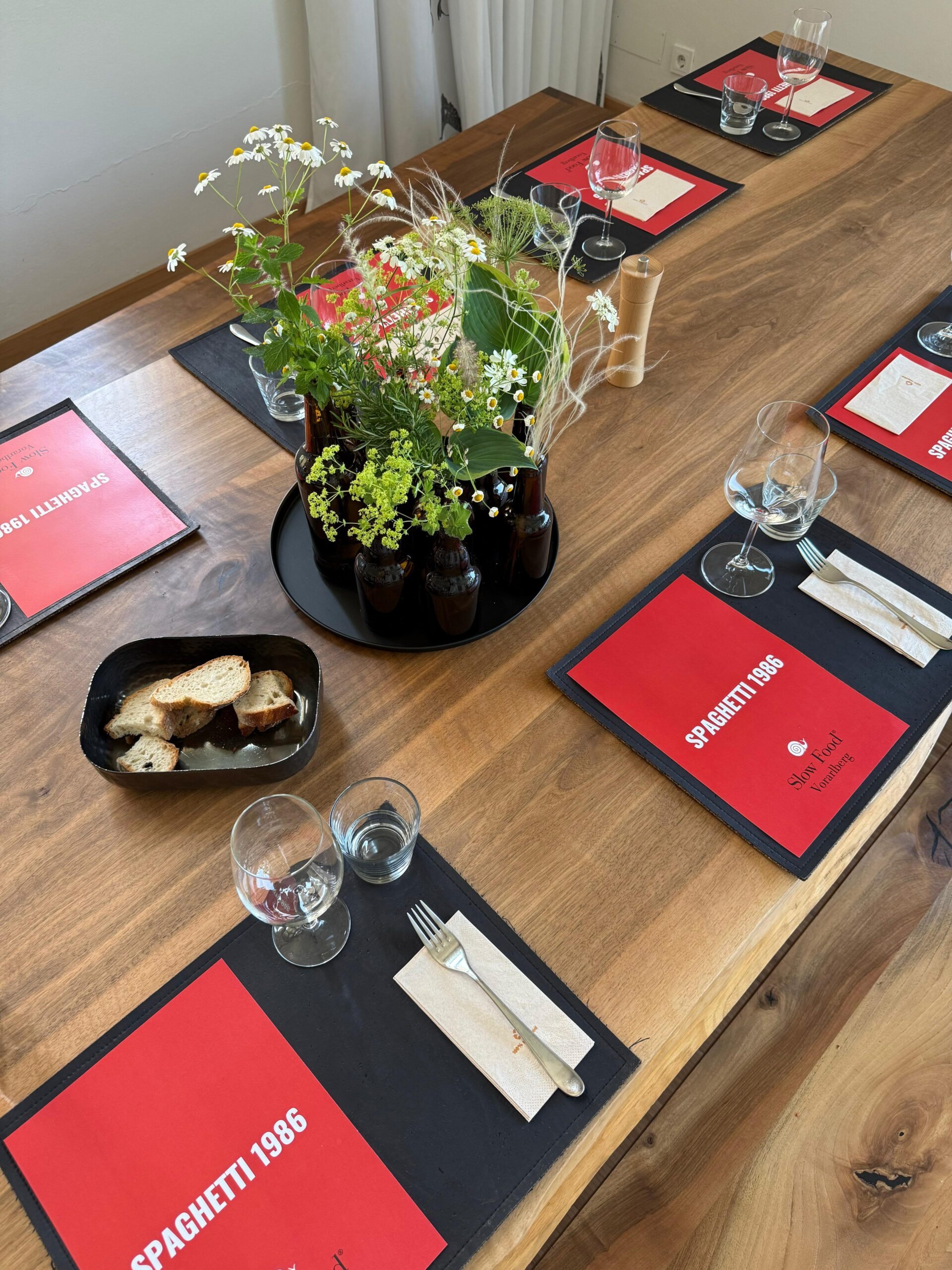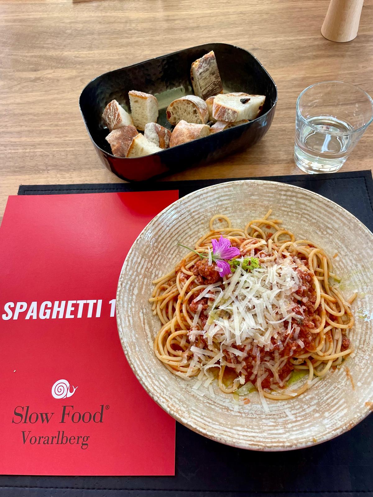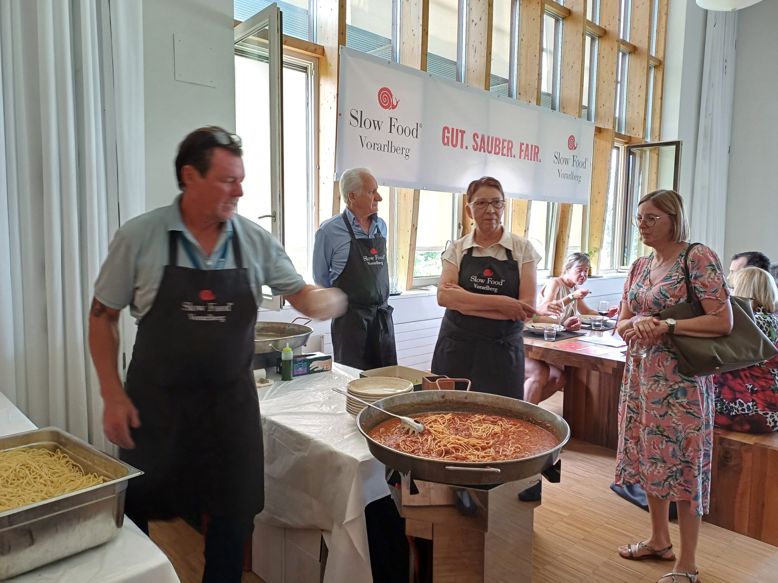 Für den Auftritt beim Food Campus Arbogast hatte sich Slow Food Vorarlberg etwas Besonderes einfallen lassen: Besucher des Food Campus waren zur frisch nach Originalrezept gekochten Protest-Pasta 1986 an eine großen Tafel geladen. Damit erinnerte der Verein an die Protestaktion von Carlo Petrini und Mitstreiter:innen 1986 in Rom – dem Beginn der Slow-Food-Bewegung. Vor Ort kochte der amtierende Präsident Wolfgang Ponier, unterstützt von einem Serviceteam engagierter Slow-Food-Mitglieder. Beim Infostand informierte der Verein über seine Aktivitäten und warb um neue Mitglieder. Unter den ausstellenden Produzent:innen: Anbieter aller fünf Vorarlberger Arche-Produkte.